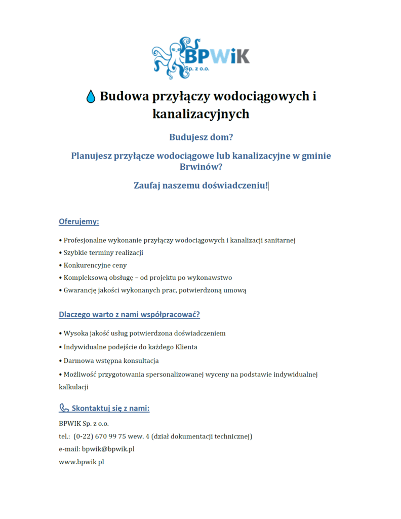 Oferta budowy przyłączy wodociągowych i kanalizacyjnych przez wykwalifikowanych pracowników BPWIK.